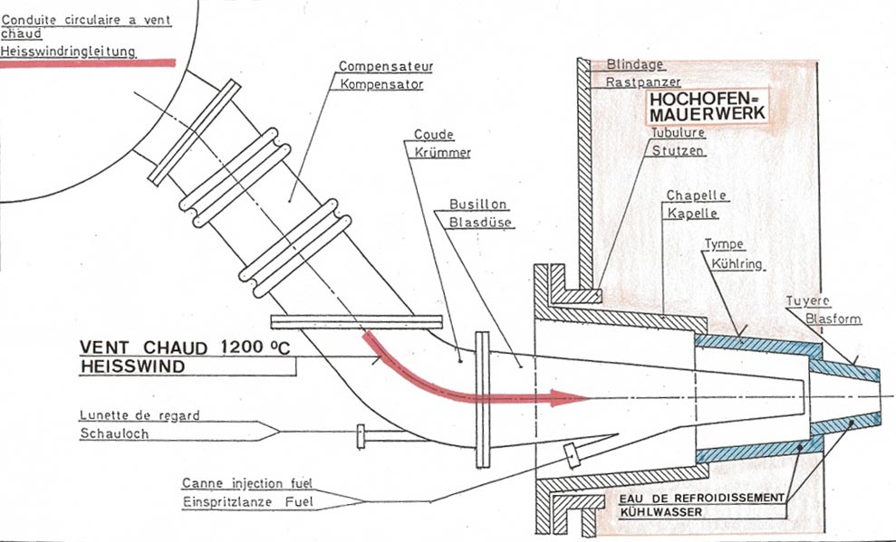 Duerch dës feierfest ausgemauert Düsestäck (= porte-vent) gët dee 1200°C warm Gebléissloft mat engem Drock vun 1,5 bi 2 bar an den ënneschten Deel vum Héichuewe geblosen.